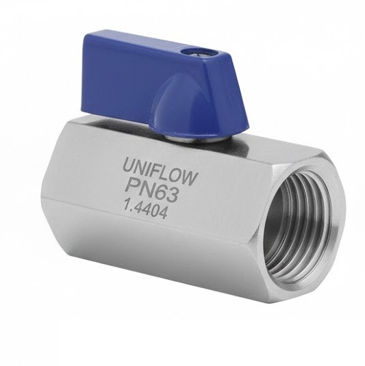 1-Piece Reduced Bore Mini-Ball Valves (F/F PN 63) are ultra-compact shut-off valves designed for space-constrained gas and liquid lines. The "1-Piece" body is cast from a single block of 316 Stainless Steel, providing maximum leak resistance and structural integrity. With a PN 63 (1000 PSI) rating, they handle high pressures despite their small size. The "Reduced Bore" and female-to-female (F/F) threads make them ideal for instrumentation, drains, and sampling.