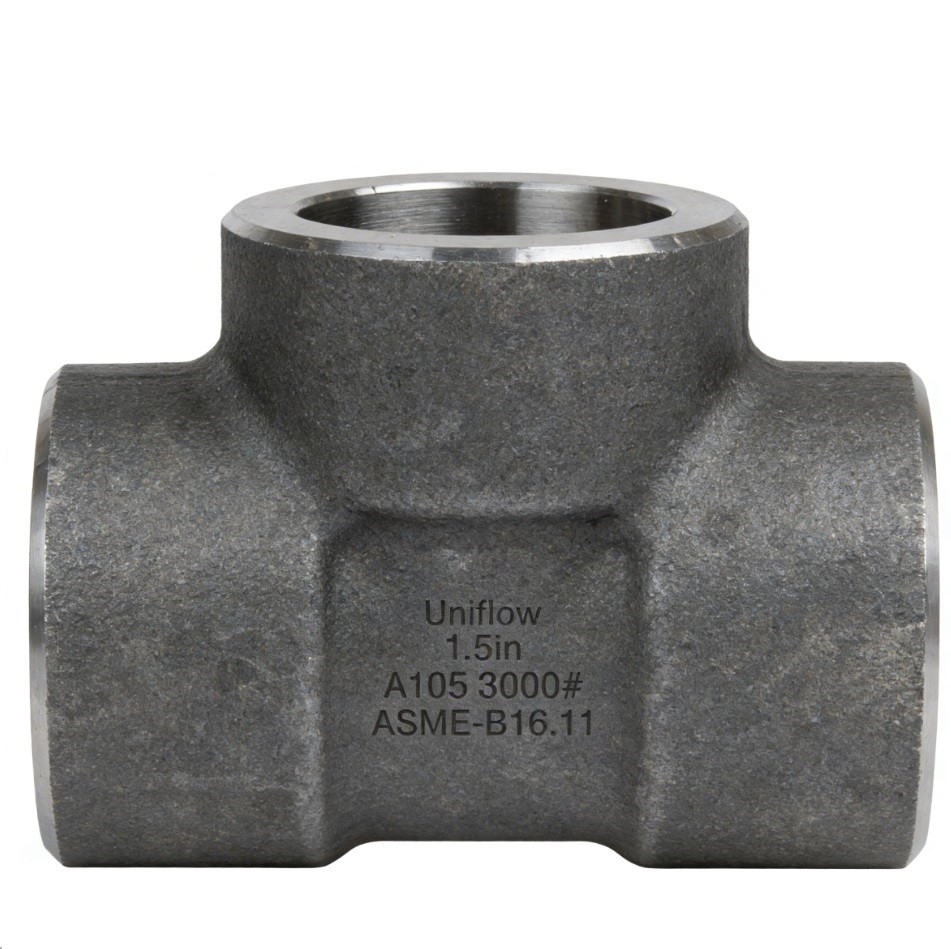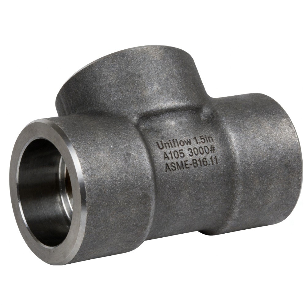 The ASME B16.11 A105 3000# Socket Weld Tee is a high-pressure forged fitting used to create a 90-degree branch in small-bore piping. Forged from ASTM A105 carbon steel, it provides exceptional strength and durability for steam, oil, and gas service. The socket weld design allows for easy pipe alignment and high-integrity fillet welds. Rated for 3000 PSI, this tee is a standard choice for industrial plants where leak-proof performance and mechanical reliability are required in high-stress environments.