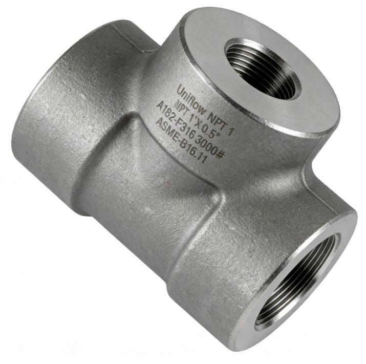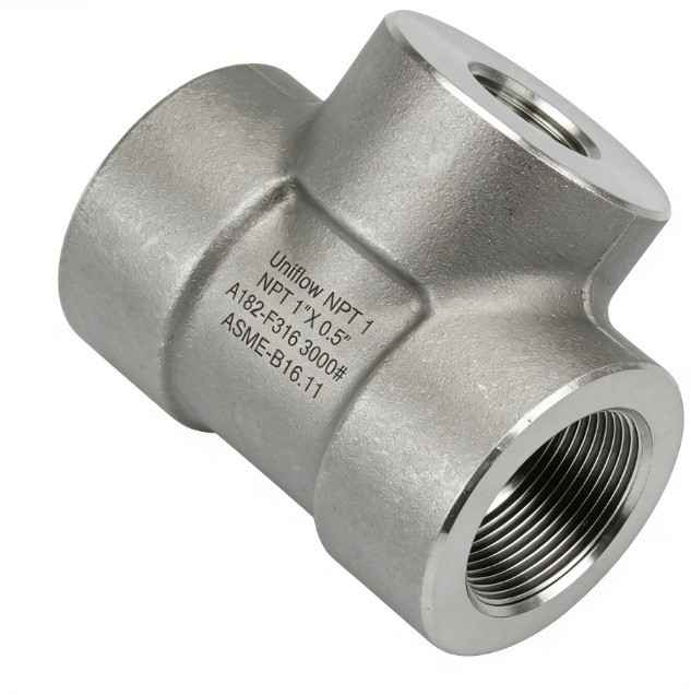 The ASME B16.11 Stainless 2000# Threaded Reducing Tee is a forged fitting used to create a smaller branch line from a larger main run. Forged from grades like 316L or 316Ti, it provides exceptional corrosion resistance and high-pressure integrity. Featuring precision NPT or BSP threads, it enables secure, weld-free reductions. Rated for 2000 PSI, it is a space-saving, hygienic solution for chemical, pharmaceutical, and offshore systems where reliable flow distribution is critical.