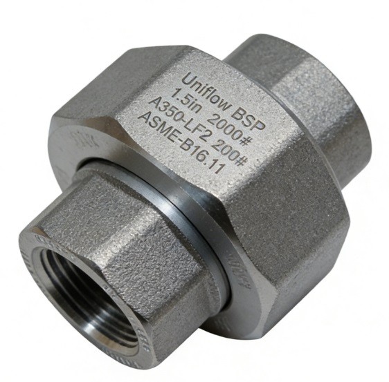 The ASME B16.11 A350 LF2 Threaded Union is a high-pressure, three-piece fitting designed for low-temperature and cryogenic piping maintenance. Forged from fine-grained carbon-alloy steel, it maintains excellent notch toughness down to -46℃. Featuring a precision metal-to-metal ground joint and BSP or BSPT threads, it enables rapid disassembly of LNG and arctic gas lines without welding. Rated for 2000 PSI, it provides a safe, leak-proof solution for systems subject to extreme thermal shock.