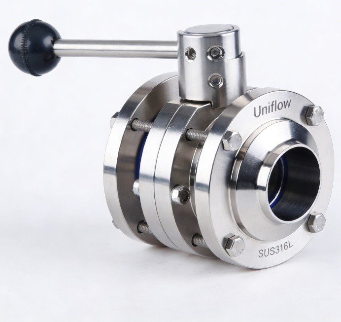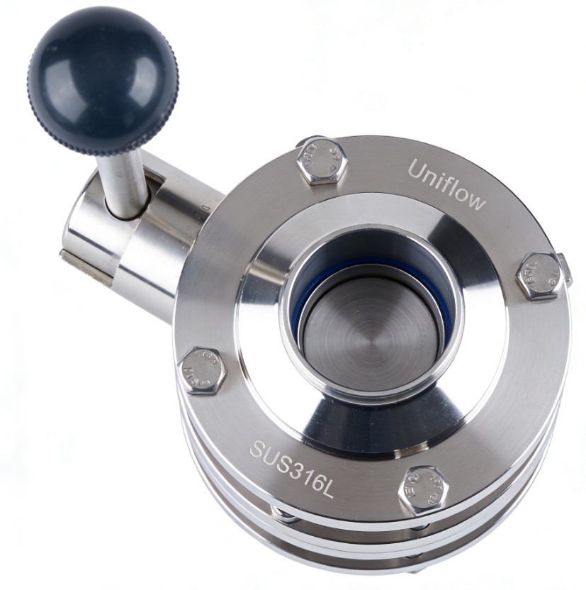 The Hygienic 3-Piece Butterfly Valve features an intermediate flange design that offers maximum serviceability. The central valve body is sandwiched between two end flanges (welded or clamped) and secured by bolts. This "drop-out" configuration allows you to remove the entire center section for seal replacement without cutting the pipeline or disturbing the pipe alignment. Made of SS316L, it is 3A/FDA compliant, providing a robust, leak-proof solution for critical sanitary headers.