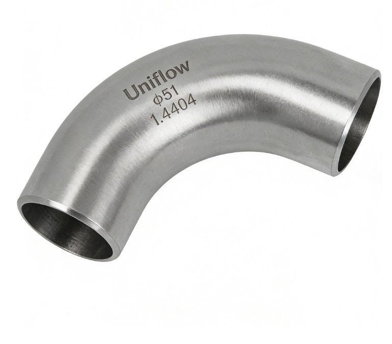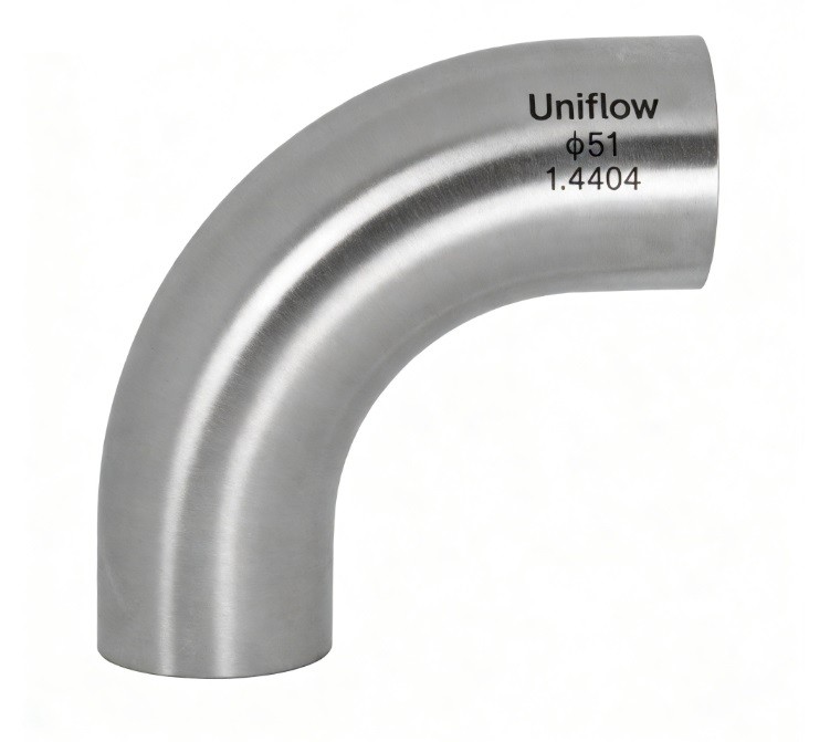 A long radius (LR) plain end elbow is a 90° or 45° fitting where the centerline radius is typically 1.5 times the nominal pipe diameter ($1.5D$). This gradual curve reduces friction, pressure drop, and product shear.Flow: Smoother transition than short radius elbows; ideal for viscous liquids.Connection: Butt-weld ends for permanent, high-purity orbital welding.Finish: Polished ID (Ra < 0.8μm) ensures no bacterial entrapment.