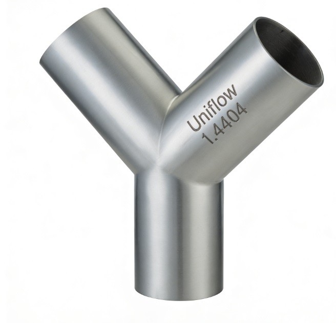 A plain end Y-shape tee (also called a 405° lateral) allows for a smooth, directional branch at a 45° angle. Unlike 90° tees, the Y-shape reduces turbulence and shear stress on sensitive fluids. Designed for permanent butt-weld installation, it ensures a seamless, crevice-free connection.