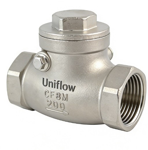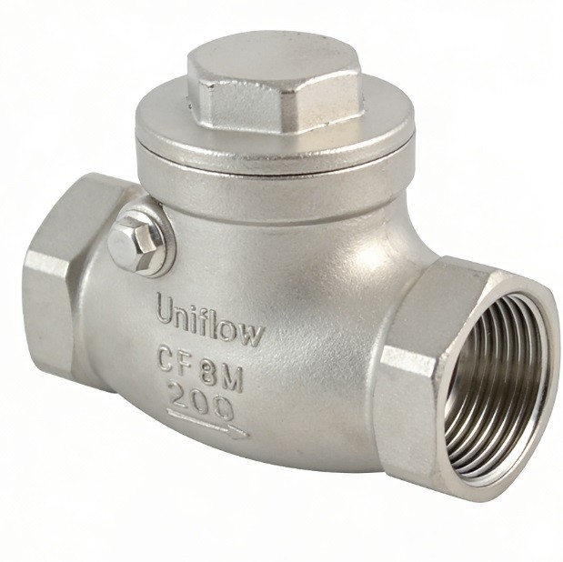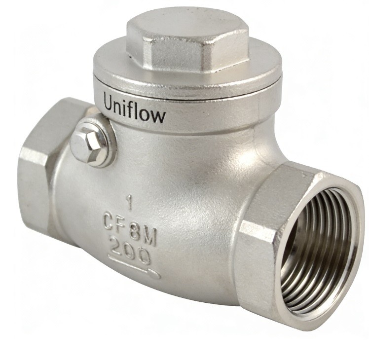 The Stainless steel screwed swing check valve is an automatic non-return valve used to prevent backflow in pipelines. It features a hinged "swing" disc that opens with forward pressure and closes via gravity or reverse flow. Crafted from SS316/SS304, it is highly resistant to corrosion. The screwed (NPT/BSP) ends facilitate easy installation in compact systems. It is best suited for horizontal flow in low-velocity water, oil, and gas applications where minimal pressure drop is required